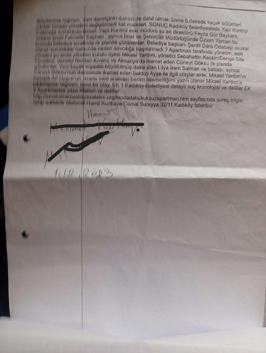 19 Aralık 2023'te belediye birinci tebligattan bahsetmeden, apartmana 2. bir tebligat yapmış. Apartman yönetimi de bu tebligatı aldığını bana ve apartmandakilere duyurmamış. Onun yerine belediye ile konuşmuş, içeriği belirsiz birkaç bin liraya bir tadilat yaptırmış, yapılan tadilatı açıklayan br yazı vermiş belediyeye ve belediye de anlaşılan bunu kabul etmiş. Apartman yönetimi bina taşıyıcı sistemi gibi hayati önemdeki bir konuda yaptırdığını iddia ettiği tadilatı, önceden bildirmeden ve onayını kat maliklerinden almadan yaptırmıştır. Ve bunu bir oldu-bitti ile bana ve apartmandakilere apartman whatsup grubunda duyurmuştur. İlaveten tebligatı ilk kez aldığı yalanını yazmıştır. Halbuki belediye 17 Temmuz 2023'te tebligat yaptığını bana yazmıştı. Apartmandakiler 2024 Mart ayında toplanarak Kat Mülkiyeti ve İmar Yasasına aykırı eylemleri belediye raporuyla sabit yönetimin süresini bir sene uzatmıştır. 11'de 8 daire bu hukuksuz kararıimzalamıştır. Ayrıca aleyhime icra davası açılması için karar almışlardır. Noter Tülay Cihangir ve Avukat Birsen Malkoç kararı imzalamamıştır ancak faturasız ve niteliği belirsiz, rapora tamamen aykırı, yapıldığı söylenen tadilatın ücretini ödemişlerdir.