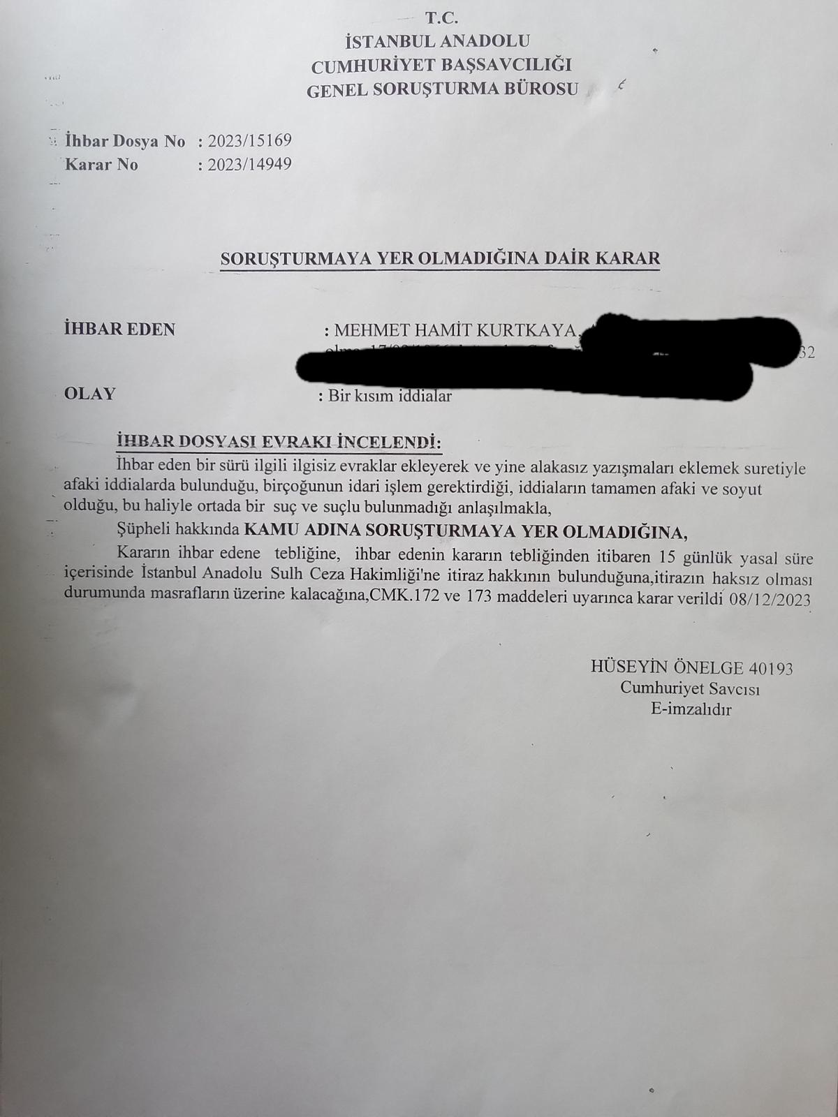 T.C. İstanbul Anadolu Cumhuriyet Başsavcılığı Dosya No 2023/280089 Karar no 132398'e itirazımdır.