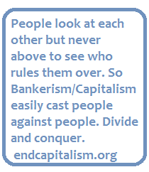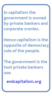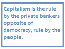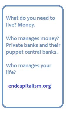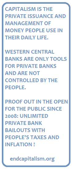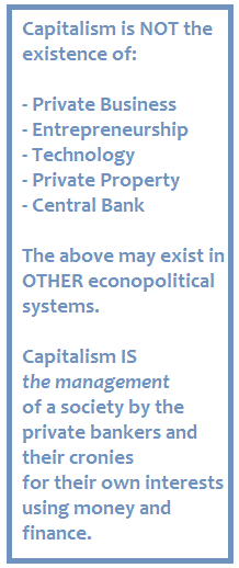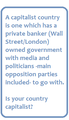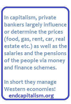 In capitalism, private bankers and the central banks they control determine all interest rates including credit card and mortgage rates that people pay, the number and the amount of loans hence employment, the distribution of loans hence winning sectors and corporations, economic bubbles (1990s tech, 2000s subprime mortgage, 2010s stock/bond), oil prices, real estate prices, rents, agricultural product and grocery prices, salaries, pensions, currency exchange rates and much more. In short, private banks (Wall Street/London and affiliates) either determine or largely influence all prices, salaries and profits in Western economies, simply put they manage Western economies. Unfortunately, people are not aware of this most basic fact except for the interest rates on their credit cards, mortgages and loans which they know are determined by the banks. They do not know why they pay 20 percent instead of 10,5,30 or 0. They do not know how these rates are fixed by the private bankers. They accept these rates as a fact of life determined in a so-called "free market" they know nothing about. Only in times of crisis such as Savings&Loans, internet, subprime mortgages that they become aware of the role private banks play in the economy. Yet they are still unaware of the fact that food prices, car prices, oil prices etc. are also influenced and at times fully controlled by the same major private banks. Employment figures too are largely influenced by central banks these private banks control and this is even publicly stated in bankers' media. Private banks manipulate all these economic numbers for their own interests! There are countless proven cases of price fixing and rate rigging including interest rates, interest market rigging (Citibank) gold price rigging ( 9 other banks involved ) and silver, oil price rigging exposed just months after Liborgate, Deutsche, Barclays Foreign Exchange Algos Rigging, insider trading cases where banks have paid tens of billions of dollars of fines since 2008 yet somehow avoided criminal prosecution thanks to Western Justice . It is not only the prices/markets that are rigged Even The Regulators Are Rigged (SEC in the US) ! And there are questions whether the NSA is manipulating the markets too US central bank (FED) admits it is causing inequality by printing money that pushes stocks higher! And who can forget Wall Street owned top rating agencies that rated all the major Wall Street/London banks and corporations which went bankrupt in 2008 including Lehman Brothers and the rest which would have gone bankrupt if they were not bailed out by the governments and central banks via money printing and loans, AAA (most safe) ? Eventually the people around the world paid and still continue to pay for these bailouts via taxes and inflation (price increases in living expenses). When almost every Western major bank and Western government body is involved in market manipulation, it is impossible to call them scandals like the banker media does. It is not an exception but the rule of capitalism. Manipulating the price of just about anything Western ruled people buy. Yet people in the West are completely oblivious to this most basic fact about their daily lives and they have fictitious, TV and academic propaganda influenced ideas about what capitalism is! Ask anyone in the West what capitalism is and you will get a variety of answers almost all wrong or incomplete.
