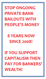 Heads they win, tail you lose. Private bank bailouts have been standart since at least the 1700s (WSJ article, Government bailouts: a short list September, 2008) , so bankers know full well they will be saved by the people when they fail. The ultimate guarantee for all the financial dealings of the banks are the people around the world! Below are just a few examples how in capitalism people around the world are forced to save private Western banks: - In capitalism bank bailouts are forever: All the big US banks were insolvent in the 1980s too! Article:December,3 2015 - Europe's Bailout Costs In One Chart: 2 Trillion euros And Counting, June,3 2012 - Conspiracy proven FACT: US FED bailed out EU and Japanese banks! September,9 2014 - Bond bubbles risk hits unbelievable 555 trillion dollars, December 22, 2014 - US Taxpayer on the hook for 303 Trillion dollars Wall Street Derivatives, December 12, 2014 - US Taxpayer Is Now A Major Counterparty To Wall Street Derivatives, April 23, 2016 - Deutsche Bank Derivative exposure 73 trillion dollars 20 times German GDP, February 3, 2016 - Italy Just Bailed Out The World's Oldest Surviving Bank - Italy's Bank Bailout Fund Already One Third Empty After First Bank Rescue, April 29 2016