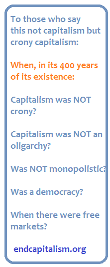 REACTIONS TO NEVERENDING BANK BAILOUTS (2008-2016) BY CAPITALIST APOLOGISTSThe bankers' good cop-bad cop economists and journalists started writing "Oh, this is not capitalism, this is crony capitalism" To these presstitudes one should ask: