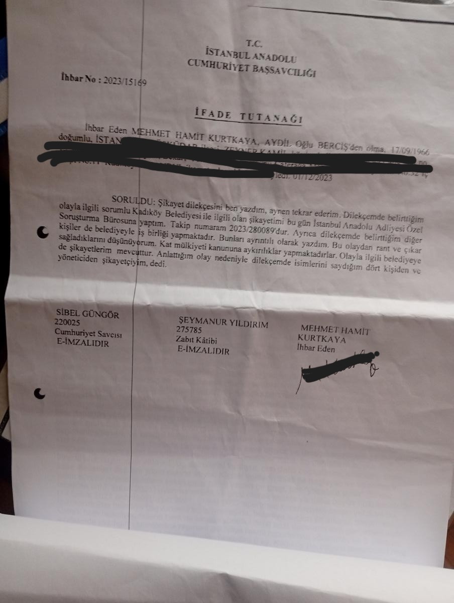 Defalarca belediyeden idari soruşturma talep edip de cevap alamayınca, savcılığa belediyedekiler, apartmandakiler ve apartman yönetimi hakkında 1 Aralık 2023'te suç duyurusunda bulundum. Ertesi iş günü olan 4 Aralık'ta aleyhime vesayet davası başvurusu yapıldığını 11 Aralık'ta polis aramasıyla öğrendim. Daha sonra da savcının hukuka tamamen aykırı 8 Aralık tarihli takipsizlik kararını öğrendim, aynı gün aleyhime vesayet davası açılmış. Savcı iddialarım için aynı cümle içinde önce afaki, sonra birçoğu idari soruşturma gerektirir, ardından tamamen soyut ve afaki yazmış. Tamamen çelişkili ifadeler kullanmış, üstelik resmi rapor ve onlarca sayfa belediye yazısı olmasına rağmen iddialarıma soyut demiş.